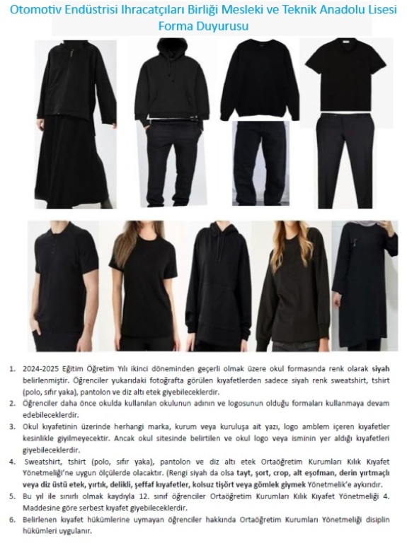 İlk dönem sonunda öğretmenler kurulunda alınan kararlar çerçevesinde 2024-2025 Eğitim Öğretim Yılı ikinci döneminden geçerli olmak üzere okul formasında renk olarak siyah belirlenmiştir. Öğrenciler linkte paylaşılan fotoğrafta görülen kıyafetlerden sadece siyah renk sweatshirt, tshirt (polo, bisiklet yaka), pantolon ve diz altı etek giyebileceklerdir.
